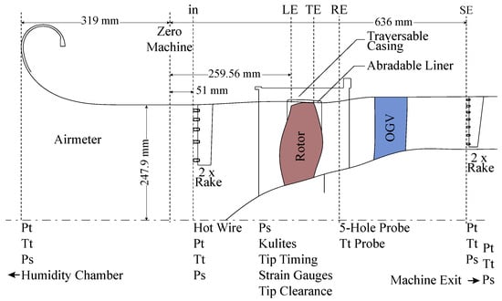 Figure 2. To reduce complexity, the setup does not separate bypass and core flow. Instead, the OGV has been designed to provide representative conditions at the rotor exit with just a single flow channel. Instrumented rakes are placed both upstream and downstream of the stage to conduct performance measurements.