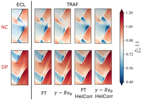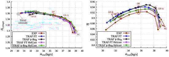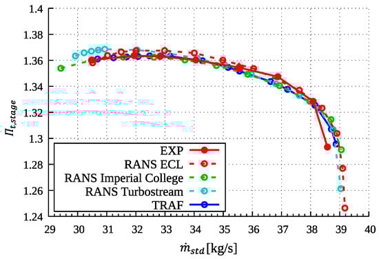 The influence of laminar flow was investigated by coupling the turbulence model with the Langtry–Menter transition model. This model improved the prediction of the pressure ratio in the knee region, but in this case, a premature numerical stall was detected, compared with the fully turbulent approach.