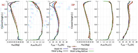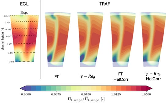 The prediction improvement was confirmed by the better agreement of total pressure maps obtained downstream the stage and the span-wise shapes of total pressure, total temperature, and absolute flow angle. A local analysis of the flow field confirmed that the use of the helicity correction was able to reduce the blade corner stall and the shock wave–boundary layer interaction in the tip region.