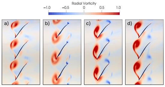 Figure 12d the vortex is once again about to impact on the adjacent blade. This time the vortex radial intensity is higher compared with the first image, and there is a negative radial vorticity region in the middle of the blade passage close to the TE. This second vortex starts developing at the TE in