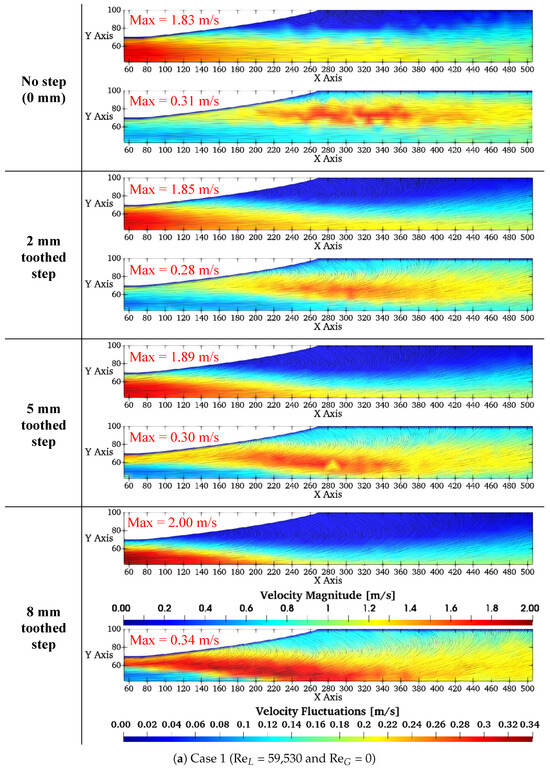 Although the flow in the channel was inherently three-dimensional [14], the velocity measurements were primarily conducted at the midsection. This region effectively captures key phenomena, including jet direction, flow separation, and turbulence intensity, all of which influence gas accumulation behavior under two-phase conditions. The data obtained at the midsection are sufficient for assessing the flow structure and enable meaningful comparisons between the various cases studied. Figure 4 shows the measured single-phase velocity magnitude and the velocity fluctuations for all considered configurations. As shown, a flow separation occurs on the upper part of the diffuser in all cases. In the reference case (without steps), the flow separation is slightly smaller compared with the cases with cross-flow steps. Additionally, it becomes undesirably larger as the teeth height increases for both flow rates. Further, the maximum values of velocity fluctuations of the 2 mm teeth decrease when compared with those of the reference case. However, for the 5 mm and 8 mm teeth, much higher velocity fluctuations are observed on the upper surface of the diffuser. The maximum values of velocity fluctuations of the 8 mm teeth exceed those of the reference case. These two effects would be useful to reduce the gas accumulation under two-phase conditions.