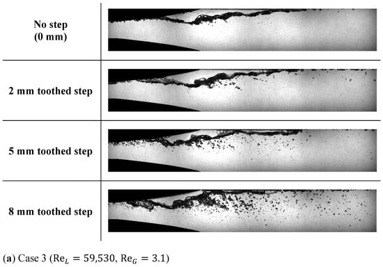 The bubble dispersion and size distributions at the inlet were measured and compared. As shown in Figure 5 for the reference case, large bubbles (typically bigger than 2 mm) are present on the top surface for all four two-phase conditions (Cases 3 to 6). Bubbles are notably larger in Case 4 with low water and high air flow. For the 2 mm teeth, a stratified flow develops at low flow (Cases 3 and 4) behind the step, where the teeth are too short to disturb the bubbles. The step merely slows down these big bubbles, leading to bubble coalescence and increased gas accumulation. However, this does not occur at higher water flow rates (Cases 5 and 6), where bubble dispersion improves slightly. For the 5 mm toothed step, bubble dispersion is observed across all flow conditions, with further improvement in the vertical direction for the 8 mm step, where finer bubbles are also seen. Crushing larger bubbles into finer ones and pushing them toward the channel center typically reduces accumulated gas in the separation zone at the top of the diverging part.