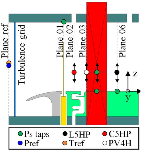 and and defined on Figure 2. At the design operating condition for the SPLEEN experimental set-up, the turbulence intensity at Plane 02 was measured to be with an integral length of 12 mm. This integral length was determined via a zero-frequency extrapolation on the velocity spectra, after filtering [34]. For the simulations presented in this paper, a synthetic turbulence injection method compliant with periodicity condition is used [35]. The simulated turbulent spectrum is a Passot–Pouquet spectrum [36] described by the integral length, , the velocity rms, , and by the cutoff length, .