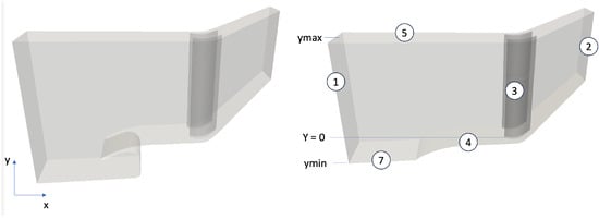 The computational domain comprises two blades as in Boudin et al. [17] and Perkins and Duchaine [21] to respect the injection of the reported turbulence integral scale at the inlet of the configuration. Compared to Perkins and Duchaine [21], the computational domain used in this work does not include the full geometry of the hub as described in Figure 2. It has been observed that including the boundary layer trap leads to a yaw angle upstream of the blade cascade not in accordance with the experimental results due to a too important deviation of the flow in the spanwise direction. The flow enters the configuration on the boundary labeled (1) and exits on the boundary labeled (2). Boundaries with labels (3), (4), and (5) are treated as walls while the fictional boundary (7) is treated as a slip wall.