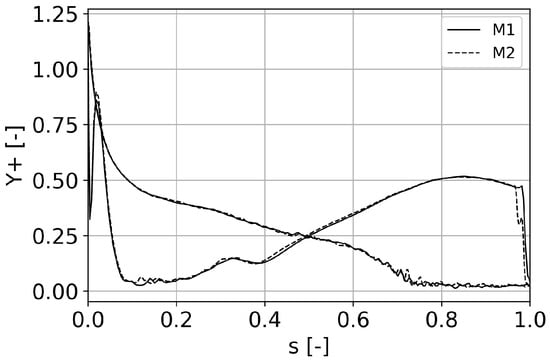 To investigate the flow sensitivity to mesh resolution, two meshes have been used, i.e., M1 and M2. The goal of these meshes is to provide a wall-resolved LES over portions of the domain where experimental data are available and feature relevant flow physics. As such, the hub wall after the tip and the blades up to about 60% of the span have a , where is the wall-normal non-dimensional coordinate relative to the wall of interest. To achieve this wall resolution, six layers of prisms are used on the blade and hub wall. For both mesh M1 and M2, the first layer height is mm, and a geometrical growth rate of 1.15 is applied. Figure 3 illustrates the obtained wall resolution at mid-span for both mesh M1 and M2 showing that except very close to the leading edge where reaches 1.25, is below 0.5 on a large portion of the profile.