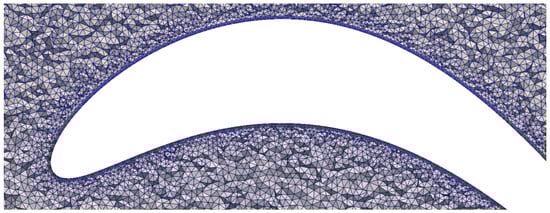 Tetrahedra are used elsewhere in the domain. The target mesh size is 2 mm except in the refined region starting from the inlet to one blade chord downstream the cascade and up to 60% of the blade span where the size is prescribed to 0.4 mm for M1 and 0.25 mm for M2 (Figure 4 and Figure 5). These resolutions are finer than in Perkins and Duchaine [21], where the transport of the injected turbulence is shown to be well captured. The resulting mesh sizes are about 90 millions cells for M1 and 220 millions cells for M2.