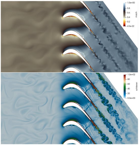 Instantaneous Mach number and Schlieren contours at mid-span of the cascade for case M2-TG. Iso-line of Mach = 1.