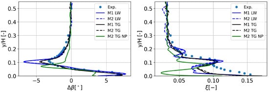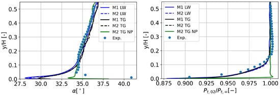 Figure 8 presents the profiles of the time and pitch averaged yaw angle along with the ratio of the total pressure at Plane 02 scaled by the reference infinite total pressure Pa. Due to the geometrical contraction in the y direction from the inlet to Plane 02, the flow accelerates in the axial direction modifies the yaw angle. Simulations M1-LW, M2-LW, M1-TG, and M2-TG are in good accordance with the experimental measurements except close to the hub wall, where the numerical predictions are too low. Conversely, case M2-TG-NP leads to an almost perfect match with the experimental yaw angle. Concerning the total pressure profile, the results obtained with cases where a profile is used at the inlet (M1-LW, M2-LW, M1-TG, and M2-TG) show as expected a good match with the experimental data while the case without inlet total pressure profile M2-TG-NP exhibits a too thin boundary layer. It is important to remember that the results of Perkins and Duchaine [21], which include the full hub geometry and no pressure profile at the inlet, lead to a too thin boundary layer, which can be corrected by an inlet profile of total pressure, as well as a badly predicted yaw angle profile ranging from 27° to almost 40° on the region of interest.