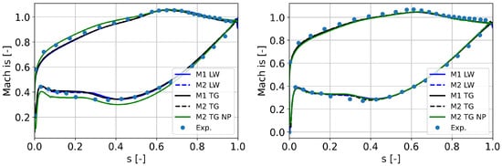 Profile of isentropic Mach number along the blade profile at = 4% (left) and =50% (right).