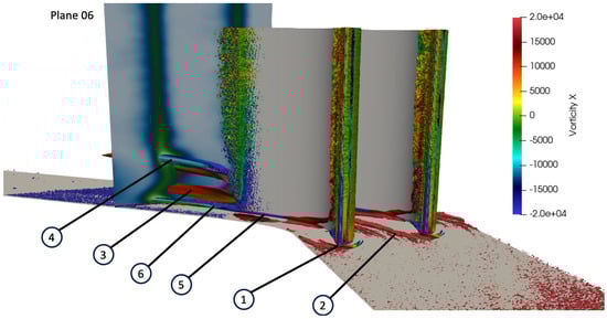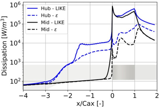 Finally, Figure 16 presents the axial evolution of the volume average LIKE and on small sections along the configuration of the hub and mid-vein regions. The hub region ranges from and , including all the locations where the secondary flows develop. The mid-vein region starts at and continues to . The axial coordinate is scaled by the blade axial chord , the leading edge being at and thus, the trailing edge being at . In the mid-vein section, LIKE and are almost equal from upstream of the boundary layer lip until , just upstream of the blade. In this region, the dissipation is mainly due to the turbulent eddies injected at the inlet of the domain with a very small effect of the acceleration due to the contraction of the domain in the y direction. As illustrated in Figure 15, the deviation of the flow linked to the blade profile induces the highest levels of dissipation in LIKE in the domain, also evidenced in Figure 16 at . As the flow passes the leading edge, turbulent fluctuations are generated increasing the turbulent dissipation rate . This later increases due to the transition of the separated bubble on the pressure side and decreases after reattachment and relaminarization of the boundary layer. The level of LIKE is always higher than by more than an order of magnitude due to wall friction and dissipation linked to the mean flow field. Due to the turbulent wake development, increase downstream from to reach a maximum around . Downstream of this maximum, LIKE and are almost equal, indicating that losses are mainly due to turbulent mixing in this region. From to −3, the dissipations in the hub and mid-vein regions show similar levels. Downstream of up to −1.75, the contraction of the flow in the y direction linked to the boundary layer trip induces an acceleration of the flow mainly in the hub region, leading to a progressive increase of the losses. At , the volume where the average is made intersects the hub wall, leading to a sharp increase of LIKE with respect to as the friction at the wall is accounted for. In the blade region, from to 1, both LIKE and show higher levels in the hub part than in the mid-vein one due to the secondary flow development leading to an increase of wall friction as well as the generation of more turbulence (higher ). These higher levels of dissipation are still present downstream of the blade as the secondary structures are still not fully dissipated ( higher in the hub part than mid-vein) and due to wall friction at the hub. When integrating loss sources in the hub and vein domains, the results show that approximately 62% of the total losses (i.e., integration of LIKE) are generated in the hub region. The turbulent dissipation represents around 18% of the losses in the hub region and 10% in the mid-vein region.