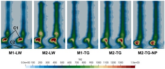 The focus of the analysis in this paper is secondary losses, which refers to the losses generated from the processes related to the interaction of the hub boundary layer and the blades. To investigate the differences between the simulated cases, the identification of secondary flow close to the hub is performed [37]. Figure 10 presents an iso surface of Q-criterion based on a time-averaged field obtained with M2-TG. The first secondary flow structure to develop is the horseshoe vortex (labeled 1), issued from the interaction between the incoming boundary layer and the blade leading edge due to a high pression region and roll up of the boundary layer. This horseshoe vortex travels down the blade passage, and the vortex generated on the pressure side is pulled by the pressure gradient towards the suction side of the nearby blade (label 2). The suction leg of the horseshoe vortex and the other shed pressure leg merge in the blade passage, forming the passage vortex (label 3). This strong passage vortex induces several other smaller vortices, notably the wall-induced vortex (label 4) and the suction-side corner vortex (label 6). A pressure-side corner vortex is also visible on the image (label 5). The five simulations with different mesh resolutions, numerical schemes and inlet conditions lead to different organizations of secondary flow structures in terms of vortex positioning, intensity and fluctuations. This is illustrated on Figure 11 which displays the turbulent kinetic energy (TKE) on Plane 06 downstream of the blade, from the hub to (i.e., in the refined region). This figure evidences the higher turbulence generated in the blade wake as well as the footprint of the secondary flow structures. A first core of high TKE (C1) corresponds to the passage and wall-induced vortex at around and the second (C2) close to the hub corresponds to the corner vortex. Comparing the cases, it is evident that the mesh resolution plays a critical role on the resolved TKE in the wake above as well as in the cores linked to the secondary vortices: as mesh resolution increases from M1 to M2, more TKE is predicted in the wakes and vortex induced cores. Whatever the mesh resolution and numerical scheme (M1-LW, M2-LW, M1-TG, and M2-TG), the secondary flows are located at the same spanwise y and transversal z location. Nonetheless, the second-order numerical scheme LW predicts higher levels of TKE in the first core C1 compared to the higher-order scheme TTG4A, the opposite being observed in the second core. The cases M1-LW and M2-LW also predict a third core of lesser intensity located just above C1, not predicted the other simulations. Finally, when it comes to the simulation with a constant inlet total pressure M2-TG-NP, the higher total pressure close the hub leads to the development of passage and induced vortices closer to the hub than in the corresponding case with an inlet total pressure profile (M2-TG).