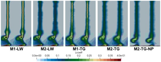 - Nicoud, F.; Ducros, F. Subgrid-Scale Stress Modelling Based on the Square of the Velocity Gradient Tensor. Flow Turbul. Combust. 1999, 62, 183–200. [Google Scholar] [CrossRef]