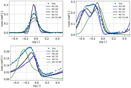 where is the local static pressure at Plane 06 and is the local total pressure at Plane 06. is the mean freestream total pressure at Plane 01 upstream of the blade, here taken to be the imposed total pressure at the inlet, 9000 Pa. is the ratio of specific heats for air, taken as . This coefficient is useful as it contextualizes the losses, which manifest as a decrease in total pressure at Plane 06. Figure 12 shows the contours of the pressure loss coefficient at Plane 06 for the five simulated cases. In all cases, the main loss region originates from the wakes of the blades and the interaction of these wakes with the secondary flow vortices. As evidenced with the TKE, two regions with increased losses can be identified, one between the interaction of the passage vortex and the wall-induced vortex (C1), and the other near the corner vortex (C2). The case M2-TG-NP exhibit as expected a slightly different distribution of these cores close to the hub compared to the other cases. Mesh resolution and numerical scheme plays an important role in the predicted losses. Increasing mesh resolution from M1 to M2 first leads to a decrease in intensity of the peak of losses in the wake region above along with a wider loss spread in the blade to blade direction. It also leads to a decrease in the loss intensity in the cores associated with secondary vortices. The effect of increasing the numerical scheme accuracy from LW to TTG4A is not evident and is further analyzed by comparing the pressure loss coefficient at different spans compared to experimental measurements. Figure 13 presents the profiles of pressure loss coefficient at , and for the five cases. In the wake region , the finer grid along with the higher order numerical scheme (M2-TG) provides better results in terms of intensity of the losses as well as spread of the wake region. At , the topology of the pressure loss coefficient is rather complex and once again, the case M2-TG leads to the better results, indicating its capability to well reproduce the position and intensity of the secondary vortices. Finally, closer to the hub at , although the agreement with experimental data is lesser, the setup M2-TG provides the more accurate results. It is also evident from these results that the imposition of a constant total pressure at the inlet leads to inaccurate results in terms of secondary flow positioning and intensity.