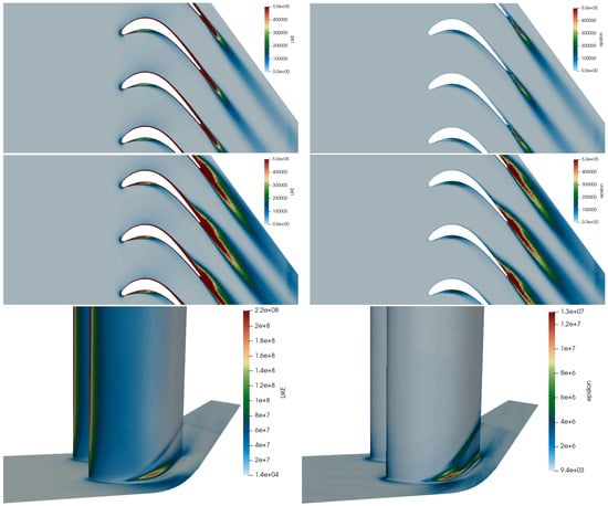 Figure 15 shows the distribution of LIKE and at mid-span, , and on the walls of the configuration. At mid-span, losses are mainly generated around the blade profile and in the wake. The dissipation of the mean kinetic energy produces high levels of LIKE in the leading edge region, pressure-side separation bubble, all along the pressure and suction side laminar boundary layers, and in the wake. The turbulent dissipation rate mainly contributes to losses in the transition region of the pressure-side separated bubble as well as in the wake of the blade. At , the contribution of secondary flows to losses is clearly identified by high levels of LIKE in the trailing edge region as well as in the wake. In these regions, the turbulent dissipation rate contributes to a large extent to the losses in kinetic energy. The distributions of LIKE and on the blade walls illustrate, first, the important dissipation due to the mean field close to leading edge on the suction side: the strong acceleration along with the thin boundary layer lead to high levels of LIKE in this region. The footprints of secondary vortices are also clearly visible downstream on the suction side: the high levels of both LIKE and close to the hub are linked to the impact of the passage vortex emanating from the pressure-side leg of the horseshoe vortex of the adjacent blade. The trajectory of the induced wall vortex is also visible, originating close to the impingement region of the passage vortex on the suction side and then migrating towards higher downstream.