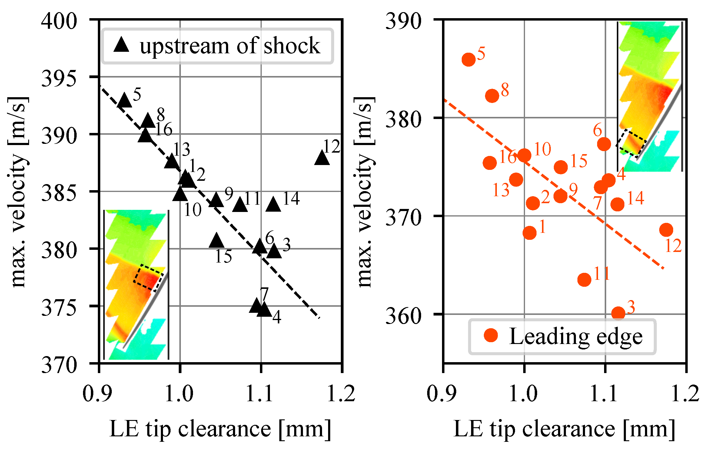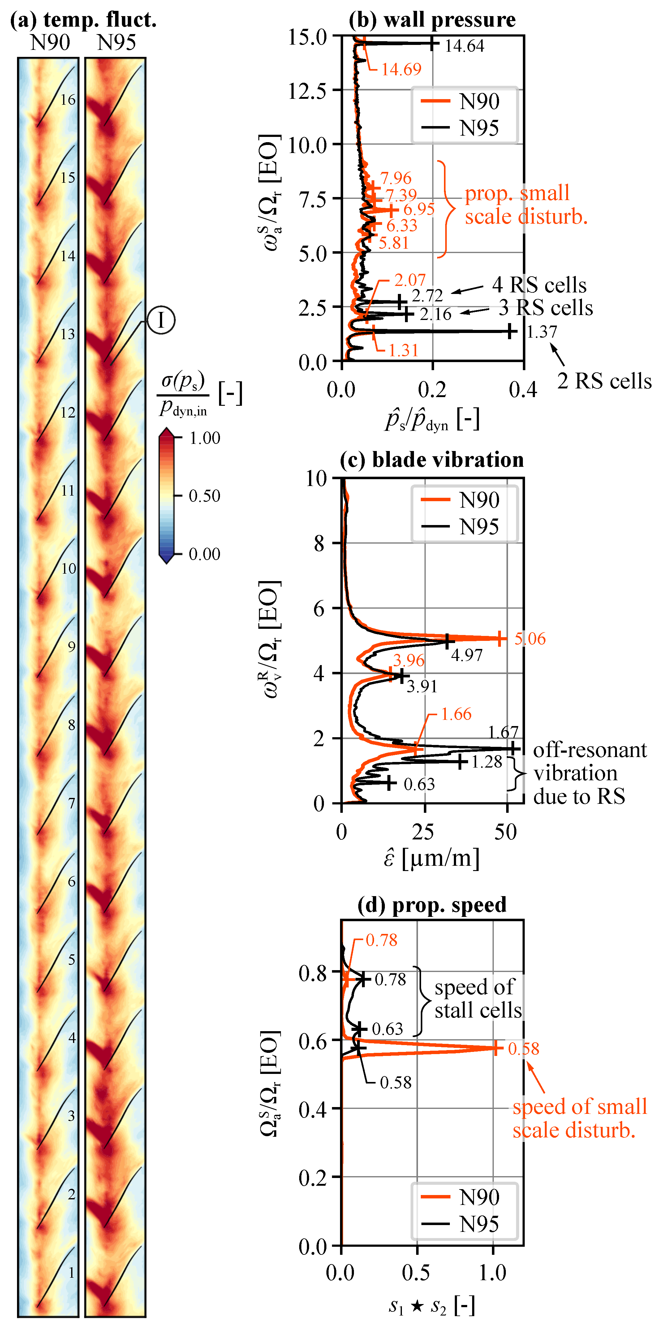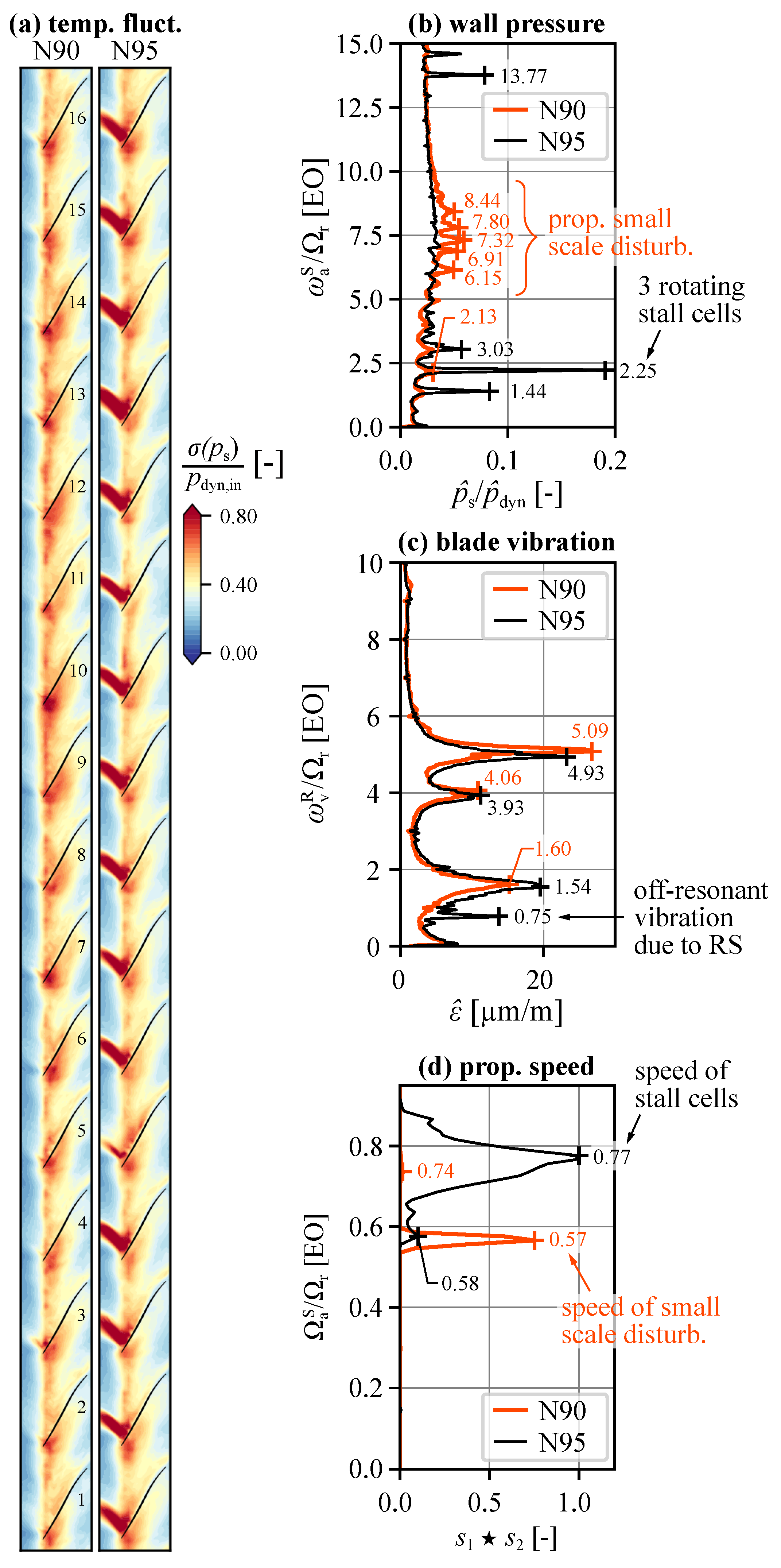 - At 95% speed, significant aerodynamic asymmetry in the form of a single separated blade is observed, long before rotating stall or NSV occurs. This blade-boundary layer separation is attributed to an unintentional misstagger of 0.3° and does not propagate in the rotor system.At lower flow coefficients, a multi-cell (2–4 cells) rotating stall is established that leads to moderate vibration amplitudes. The associated performance degradation is negligible. Further reducing the flow coefficient causes continuously increasing vibration amplitudes until safety limits are reached and the emergency bleed is opened. These vibrations are off-resonant with blade-eigenmodes and considered as non-synchronous forced-response.