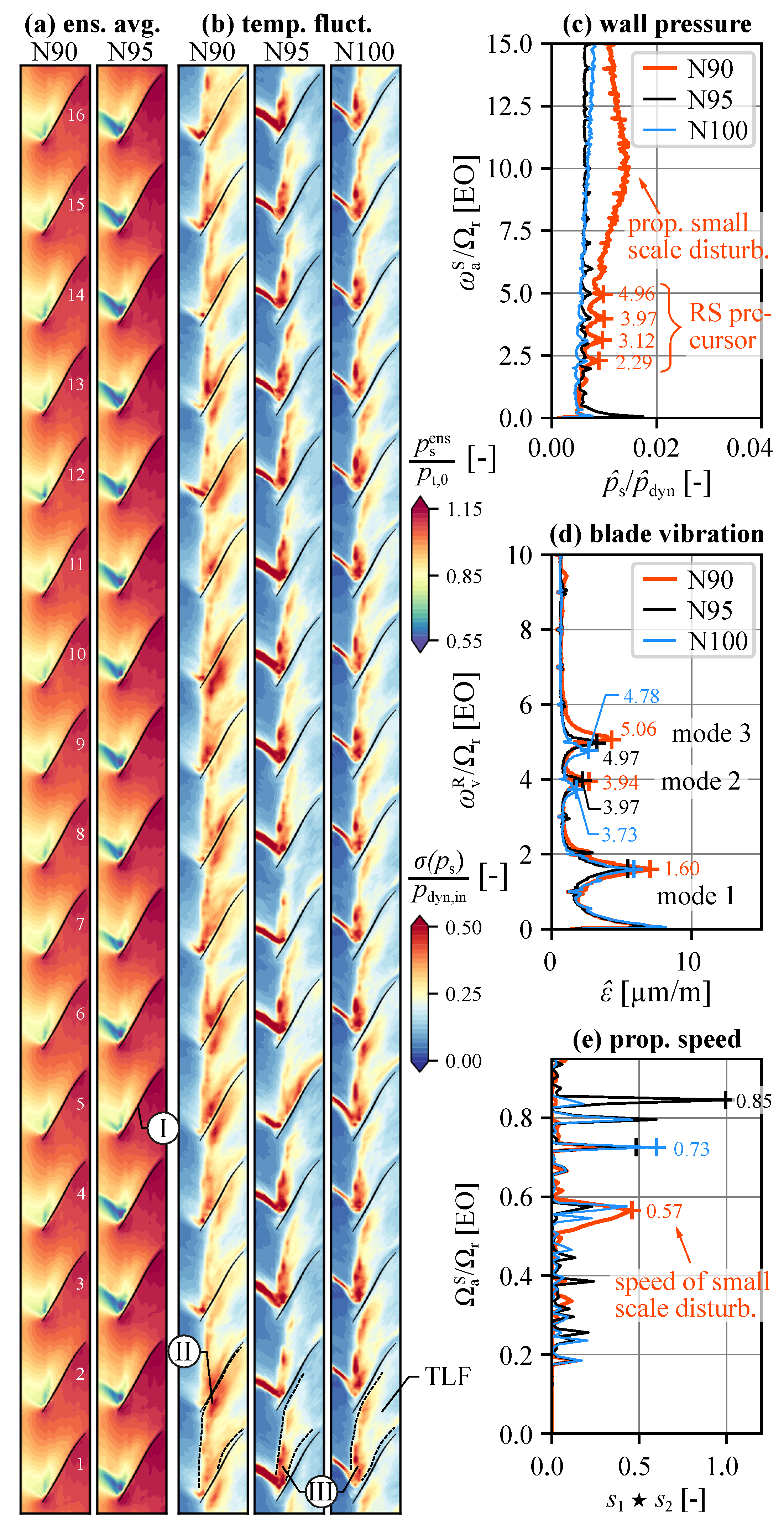 - At 90% speed, small-scale convective disturbances form coherent aerodynamic waves, one of which locks in with the third blade eigenmode, resulting in non-synchronous vibration amplitudes that continuously increase with throttle degree until measurements are stopped at a comparably low flow coefficient.