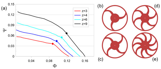 Rotor geometry and characteristic curves: (a) characteristics curves with diamond symbols indicating the investigated operating points corresponding to Pa and m3/s; (b–e) 3-, 4-, 6-, and 9-blade configurations.