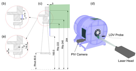 Experimental facility: (a) rotor gap geometry; (b) in-gap LDV traverse; (c) LDV traverse and PIV measuring plane (green box); and (d) ISO 5801 test-rig and experimental setup (LDV and PIV).