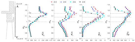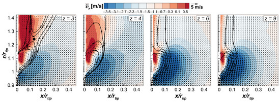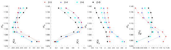 Figure 8 shows the radial distributions of , , , and in front of the rotor at (see Figure 3c). These data show the effects of on the velocity fields in front of the rotor due to changes in the leakage flow pattern. The axial component is only marginally affected by the variation in the number of blades. Its minimum negative peak moves slightly outwards for the cases and 4 compared to the other ones, consistently with an increased radial migration of the leakage flow for these conditions (see Figure 5). For and 4, positive values of are indeed observed above the blade tip, i.e., 1. For , is slightly positive in the gap region, while for , the flow is always centripetal. For , i.e., below the blade tip, the higher the number of blades, the lower , with for all cases.