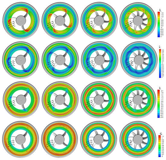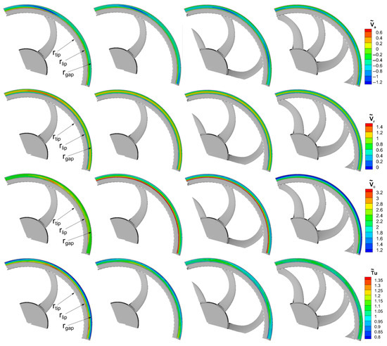 Figure 7 shows the phase-averaged velocity component distributions in the gap area. In order to improve the readability of the plots, a single 130-deg sector is depicted to enlarge the plots without losing information. The distributions indicate that a certain periodicity is present for all the considered geometries. In the gap zone, a region of localized minimum values of is observed (indicated by the blue contoured area). Its tangential and radial extension, as well as the magnitude, strongly depends on . In the case , the maximum extension is reached with values close to −1.2. Moreover, this zone has a spiral shape and wraps about the axis opposite to the rotation direction, reaching the external gap radius () within nearly three blade tip chords. In the case, such an area of negative has smaller extension and magnitude but has the same shape as in the case. In contrast, in the two remaining cases, the spiral shape modifies in a circular one. Such a characteristic indicates that these minimum spots are confined in the central part of the gap section. Furthermore, even the minimum values reduce as increases. The distributions are in agreement with the ones, indicating that periodicity also weakens for this component as increases. Moreover, this confirms that the leakage flow has a centrifugal behavior at all tangential locations in the gap. Unlike and , is more uniform. In the case, only a maximum is present, with the same location as the ones of the other components’ maxima. For , six large values are located close to the fan ring, while reduces along the radial coordinate. In the case, shows the lowest values compared to the other geometries. In the case , the unresolved unsteadiness has again a periodic behavior with a turbulent spot located close to the rotating ring, and nearly coincident with the one. At larger radii, progressively reduces. As increases, the periodic pattern weakens and disappears for since the distribution is nearly uniform. In summary, the analysis of these results shows that both the mean and the periodic parts of the leakage flow are strongly sensitive to and to the blade loading.