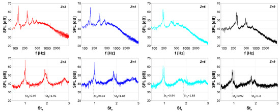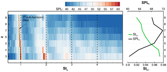 where the summation extends to all frequency bands included in the relevant range. Namely, it includes all the points about the subharmonic peak whose contribution to the integral is relevant, i.e., the ones included in a range of a 10 dB height below the peak. Prior to the summation, the contribution of the tonal components at the BPF was removed from the spectra. This is of major importance in cases and 4, since the first subharmonic peak merges with the BPF one; see Figure 10: in the former case, a lower side peak may be detected at , while in the latter, a kind of knee may be detected at on the left-hand side of the peak at BPF. Then, the subharmonic hump is reconstructed, assuming that the peak at the BPF is symmetric. This has allowed us to estimate the tonal-noise-related part of the SPL on the low-frequency part (left-hand side of the peak) based on the high-frequency part (right-hand side). Hence, the corresponding acoustic intensity was computed as and subtracted to the original one, which includes the observed knee. This was performed point by point, yielding the estimated trend of the subharmonic hump. Focusing on the first subharmonic peak/humps makes sense since prominent peaks are well-known sources of annoyance compared to even stronger broadband parts; e.g., see [34]. In the contour plot, besides the crests associated with the tonal components, the ones related to the leakage noise are apparent. The first one has a frequency shift increasing with z, since it moves toward smaller , and the related SPL increases with z up to , where it peaks and starts decreasing. Such trends are represented in the right plot of Figure 12. The second subharmonic crest is broader and less sharp and also bifurcates as z increases. The higher-order subharmonic crests appear as lower-level humps in the low-z areas of the plot, becoming less important as the order increases. Such less definite trends could be related to a loss in coherence in the large-scale flow structures emanating from the gap, whose contribution to the SPL spectrum affects a broader frequency range but more uniformly.