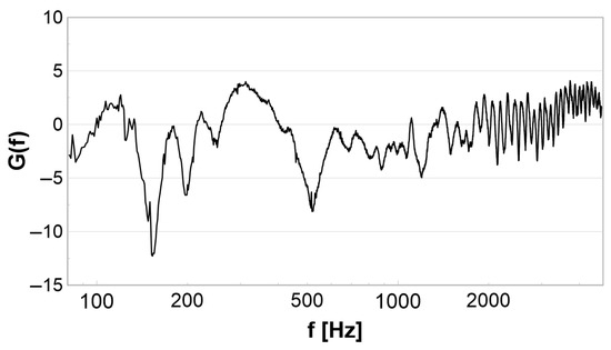 Figure 10 reports the SPL spectra related to the four rotors tested aerodynamically. In all of them, the possible distortions due to propagation effects have been minimized, subtracting an average propagation function G computed by means of the method reported in Canepa et al.’s work [33]; see also Section 2.3. Such a propagation function is reported in Figure 11 and shows four dips below 1 kHz and an oscillating trend between 2 kHz and 3.5 kHz. Only the dips affect the part of the spectra relevant to the present study. The oscillations are due to vibrations of the plastic walls of the test plenum, which in turn depend on the tensile stress generated by the pressure inside the plenum. They cannot be completely eliminated by the spectral decomposition algorithm since the modal frequencies of the plastic sheet depend on the rotational speed through the pressure rise. However, they affect a range of the spectrum that is not of interest to the present study and are thus disregarded. In the top plots, the SPL spectra are plotted up to 5 kHz ( Hz, ) with the aim of showing the overall trend. In the bottom plots, the SPL spectra are plotted versus the Strouhal number divided by the blade number, i.e., . Accordingly, the blade passing frequency (BPF) corresponds to in all cases. The spectra are shown up to the third harmonic of the BPF. To provide a more detailed characterization of the SPL spectra in the low- to mid-frequency range, where the leakage noise has a major effect, Hz is adopted. As a result, differences in level between the two sets of spectra of about 4 dB appear.