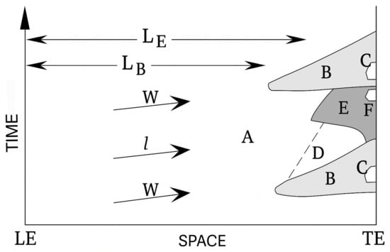 The transition process in an LPT typically follows a multi-modal path, influenced by periodic wakes generated by the upstream blades. In Figure 1, a qualitative overview of the transition modes is presented, illustrating their spatial and temporal evolution within a blade cascade. The different zones are defined in Table 2. It is evident how the boundary layer transition location shifts over time, progressively moving towards the leading edge until a becalming zone (D) emerges, only to become turbulent again. Special attention is given to the becalming zone, as this reverse transition can influence the development of primary instabilities, such as Tollmien–Schliching waves, as well as secondary instabilities that lead to turbulent breakdown, ultimately increasing losses. Moreover, it may contribute to the formation of Laminar Separation Bubbles (LSBs) or result in a more extensive turbulent detachment.