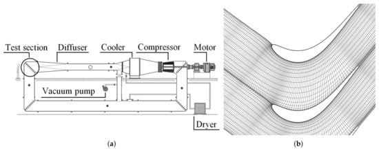 As depicted in Figure 3a, [24], a 13-stage axial flow compressor drives the continuous closed-loop facility of the wind tunnel, and a heat exchanger allows for maintaining the flow temperature at near ambient conditions. A vacuum pump is present, and the cascade test section is mounted in the first elbow of the loop, following the diffuser.