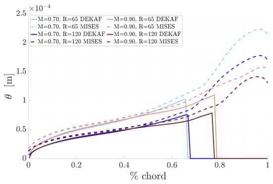 The first property analyzed is the momentum thickness, Figure 4. This finding demonstrates that the boundary layer becomes thicker along the blade surface and is affected by both Mach and Reynolds numbers. Specifically, for a given Mach number, an increase in the Reynolds number results in a decrease in the maximum momentum thickness, suggesting that the boundary layer profiles become thinner and the viscous effects on the wall are reduced. A similar, though less marked, trend is observed when the Mach number increases for a given Reynolds number. Finally, the solid lines reach zero at a certain streamwise location due to the impending transition, which causes the BL solver to be unable to continue solving the boundary layer flow.