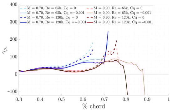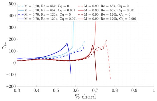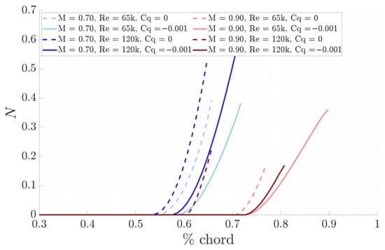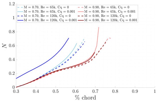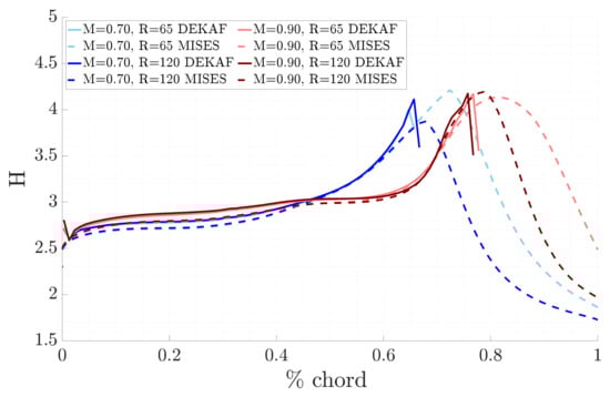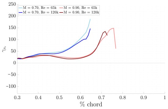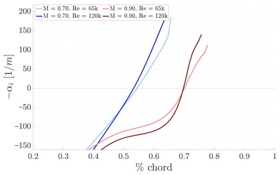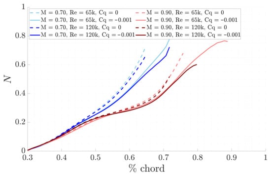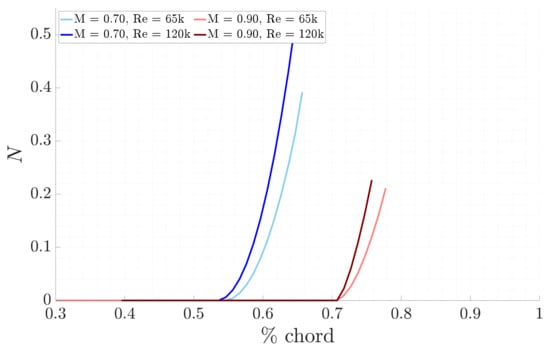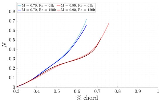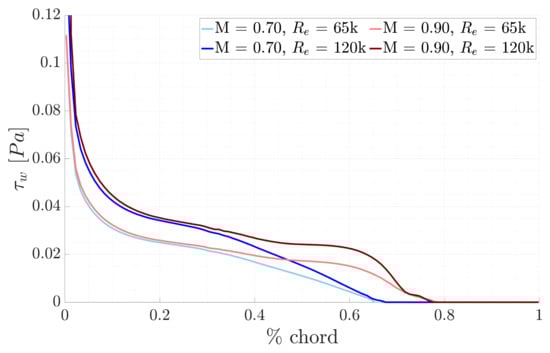 Finally, the wall shear stress is affected by both the Mach and Reynolds numbers, as depicted in Figure 6. Notably, all curves show a decrease in the streamwise direction due to the thickening of the boundary layer. As the Mach number increases for a given Reynolds number, the rises, driven by the enhanced compressibility of the flow. Conversely, for a fixed Mach number, an increase in the Reynolds number leads to a higher velocity gradient at the wall, resulting in an increase in along the blade surface. This increase is more marked for compared to . Towards the end of the graph, all curves converge to very low values, indicating a potential flow separation and transition.