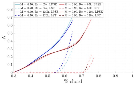 All these results highlight that the selected unstable mode begins to amplify much earlier on the blade suction side according to the global theory, compared to the local theory results. This is illustrated in Figure 11, where the LST results are represented by dashed lines and the LPSE results are depicted by solid lines. This discrepancy occurs because, in the LPSE, the N-factor rises immediately and reaches higher values since the instabilities are already present and amplifying when non-parallel effects are considered.