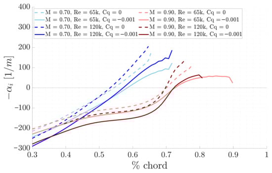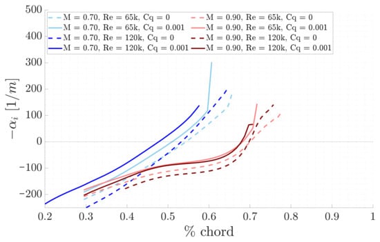 The stability results are here shown with . First, the suction technique results are discussed. The LST physical growth rates, shown in Figure 13, show that the transition of the selected unstable mode, from being damped to amplified, occurs later compared to the respective base case. This finding is also reflected in the N-factors envelope, reported in Figure 14: the curves begin to rise exponentially as the perturbation starts to grow, but later than the respective base case. The LPSE results, in Figure 15 and Figure 16, further support this observation.