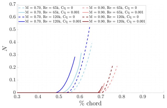For the LPSE analysis, the physical growth rates and the N-factors are illustrated in Figure 9 and Figure 10, confirming the previous results. In fact, for a given Mach number the unstable selected mode begins to amplify earlier as the Reynolds number increases. Similarly, at higher Mach numbers, the onset of amplification occurs later. Additionally, a rapid acceleration in the amplification of the mode is observed, as expected from the global theory where local, upstream, and historical flow conditions are considered. Finally, the peaks observed after a certain streamwise location occur because the boundary layer is no longer being solved, as discussed in Section 5.1, Figure 4.