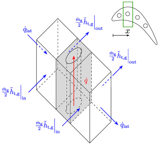 Infinitesimal control volume comprising the metallic blade with a representative cooling channel and both the gas and coolant domains. The blue arrows represent the hot gas thermal powers, whereas the red arrow represents the coolant thermal power. The position of the infinitesimal slice in the bladed row is highlighted in green in the top right corner.