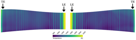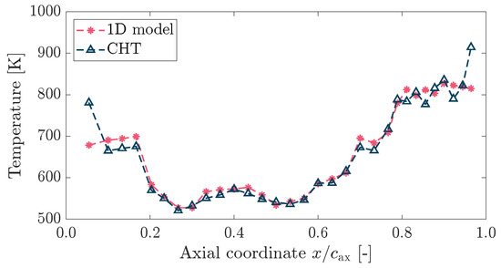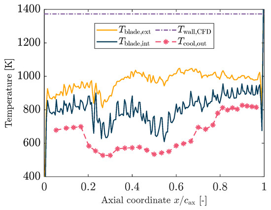 The striped wall temperature shown in Figure 9 is due to the presence of the cooling channels, which reduce the temperature locally. It is worth noting that the temperature in Figure 9 is not constant in the spanwise direction, contrary to what was assumed during the development of the 1D model. However, considering that the variation is minor and occurs mostly on the suction side, it is therefore reasonable for the 1D code to assume no radial evolution of the temperature.
