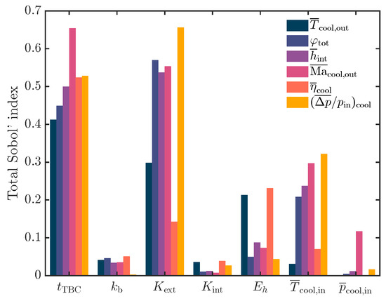 To evaluate quantitatively the impact of the i-th input variable on the j-th output variable, Sobol’ indices are used. In Figure 3 are shown the total Sobol’ indices defined by Equation (7) in [30], where and .
