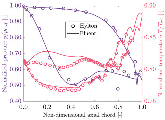The normalised static pressure and static temperature at the wall extracted from the Fluent case are compared to Hylton’s experimental data in Figure 4.