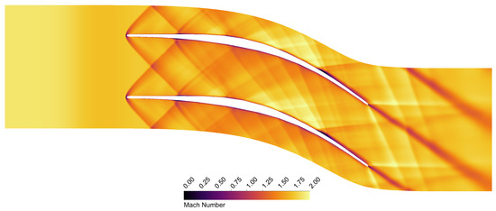 In this section, only the results of the 31-channel case are analysed, as it was shown in Section 3.2 that the 15-channel solution has a lower performance. The hot gas Mach field and the shock structures are visible in Figure 5.