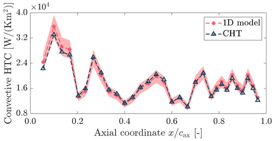 The choice of the wall-function-based coefficient is due to the necessity of keeping the height of the first cell above the sand-grained roughness of the channel’s internal surface. With the chosen average roughness, the non-dimensional wall distance of the first cell would be well above 5; therefore, calculating the heat transfer coefficient using the temperature of the first cell instead of would lead to an incorrect estimation of the convective coefficient. Since the coolant flow at the wall is modelled rather than solved, choosing the wall-function-based coefficient is the most consistent choice. The agreement between 1D code and CHT simulation is excellent: the values extracted from the CHT simulation lie entirely within the uncertainty band of the correlation, with the average error being . The area-averaged external heat transfer coefficient is W/(K m2), whereas the internal heat transfer coefficients mass-averaged over channels 8–19 is W/(K m2).