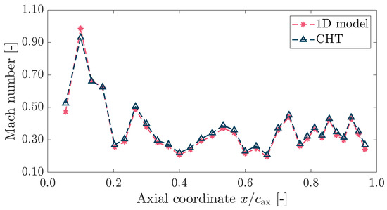 Comparison between the outlet coolant Mach number as predicted by the 1D code and as extracted from the CHT simulation.