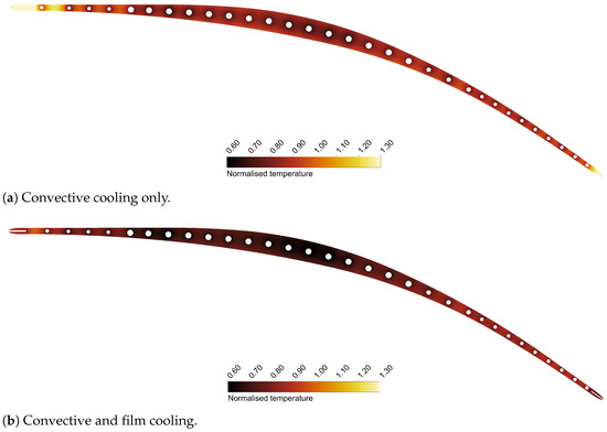 Normalised temperature field inside the blade at midspan. Following [40], is set to 1000 °C. For the sake of comparison, in the convective cooling case, the contour plot is capped to 1.30, as any value higher than this would be meaningless.