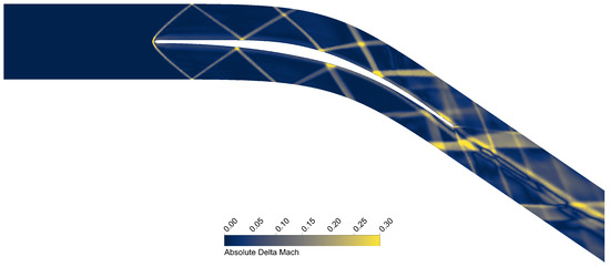 The temperature reductions at the leading and trailing edge are clearly visible in Figure 10b compared to Figure 10a. The absence of hot regions at the leading and trailing edge diminishes the heat conducted towards the central region of the blade, lowering the temperature also there. The disturbance on the external flow field is evaluated in Figure 11 as a difference in Mach number with respect to the case with only convective cooling shown in Figure 5. Since shocks are regions of high gradients, a small change in position creates a great change in Mach number, as visible in Figure 11. Outside of the shocks and their reflections, the Mach number field is almost unperturbed. The interaction between the two opposite fluid streams causes a total pressure loss of 1.82%. Considering that the blade is now able to withstand the high-temperature environment, this loss increase, while not negligible, is acceptable. Overall, coolant injection at the leading and the trailing edge is a possible successful strategy for the thermal control of a RDE blade, as it lowers the temperature of the entire blade without producing excessive disturbances in the external flow field and requiring a modest increase in the amount of coolant mass flow rate. To the authors’ knowledge, this is the first contribution in the literature proposing a solution able to cool down an RDE blade.