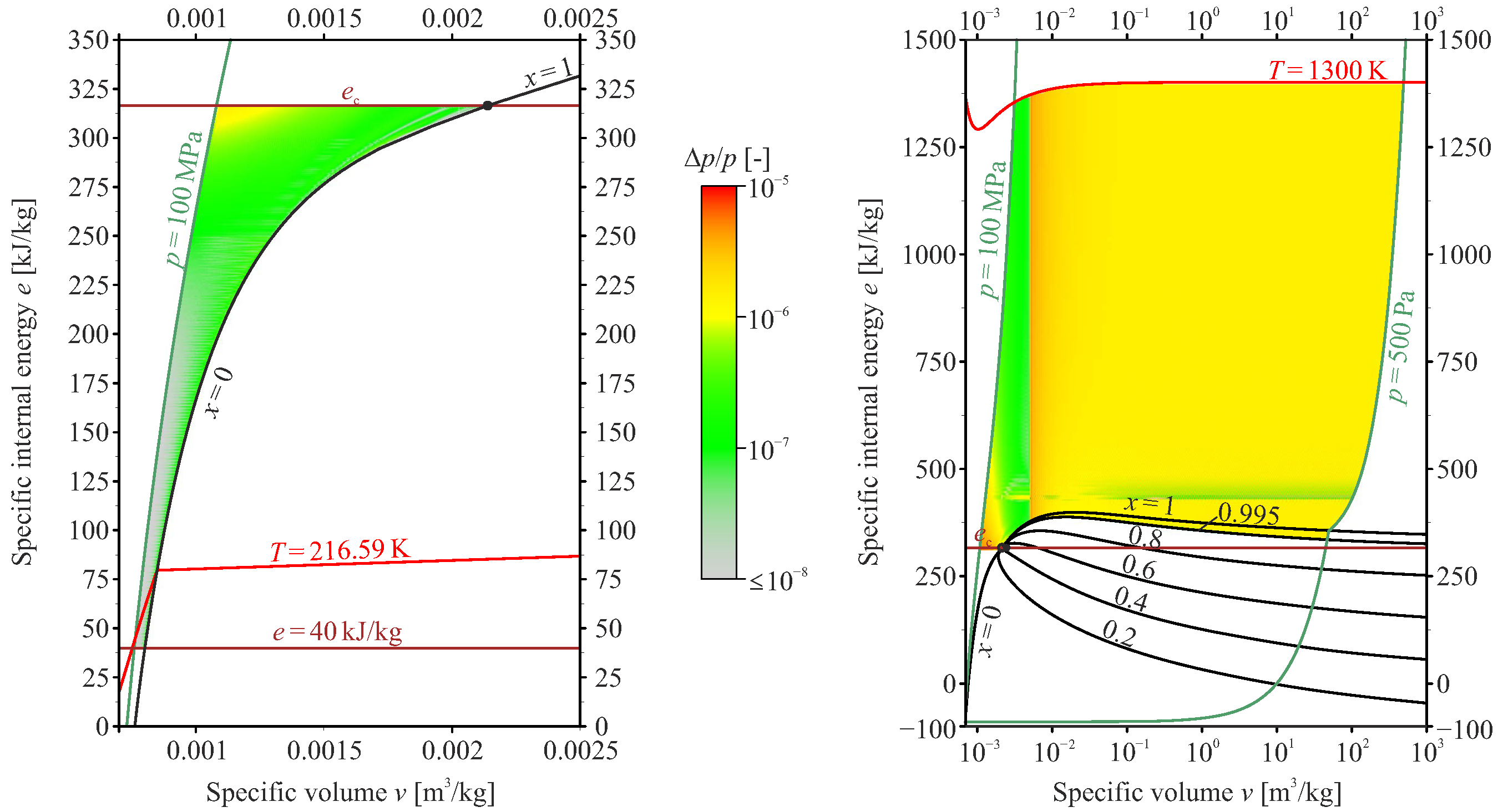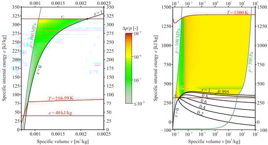 The primitive (sometimes referred to as physical) variables are calculated by the state-of-the-art reference EoS by Span and Wagner [] (hereafter referred to as the ) from the vector of conserved variables U. Since the evaluation of the multiparameter EoS can easily become a performance bottleneck in the context of scale-resolving simulations [], a spline-based table look-up method (SBTL) is used. The SBTL method employs biquadratic polynomial spline interpolation, addressing key shortcomings of traditional local interpolation techniques like bilinear or bicubic schemes. Unlike bilinear interpolation, spline functions offer continuous first derivatives. Additionally, biquadratic spline polynomials can be analytically inverted with respect to their independent variables, enabling fast and numerically stable backward evaluations—unlike bicubic interpolation, which requires computationally intensive inverse functions involving trigonometric evaluations. The spline functions are built on piecewise equidistant nodes in transformed variables, facilitating linearization and allowing for the use of simple search algorithms. Thermodynamic property grid points for CO2 are computed using the , along with molecular viscosity and thermal conductivity correlations from Laesecke et al. [] and Huber et al. [], respectively. For tabulation, specific volume v and specific internal energy e are selected as the independent thermodynamic variables, as they can be directly obtained from conservative variables by