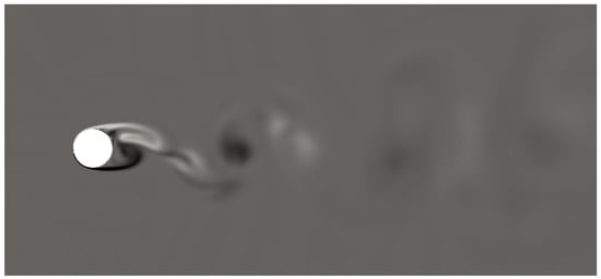 A snapshot of the spanwise component of the vorticity is presented in Figure 3. The alternating separation of the boundary layer results in a time-dependent recirculation region downstream of the cylinder (in the considered subcritical regime, the boundary layer remains laminar, even directly after separation). The primary vortex zone is formed from the Kelvin–Helmholtz instability, generated in the two shear layers at the edges of the separated flow. Smaller vortices accumulate forming a large-scale structure behind the cylinder and decay as the flow moves downstream of the cylinder. Continuous vortex shedding leads to the formation of the characteristic von Kármán vortex street, which can be observed in Figure 3.