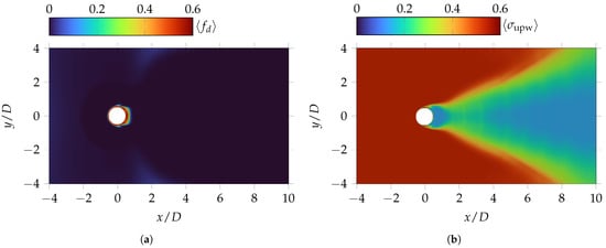 The time-averaged value of the flux blending factor, , is shown in Figure 4b, where a higher value indicates the prevalence of the upwind-biased scheme. As discussed in Section 2.4, in accordance with the flux sensor design [], an upwind dominance is observed in the irrotational regions of the flow and on the cylinder surface, which is treated as a pure RANS region. Conversely, a prevalence of the central scheme is observed in the wake region, consistent with the results for the same case reported in [].
