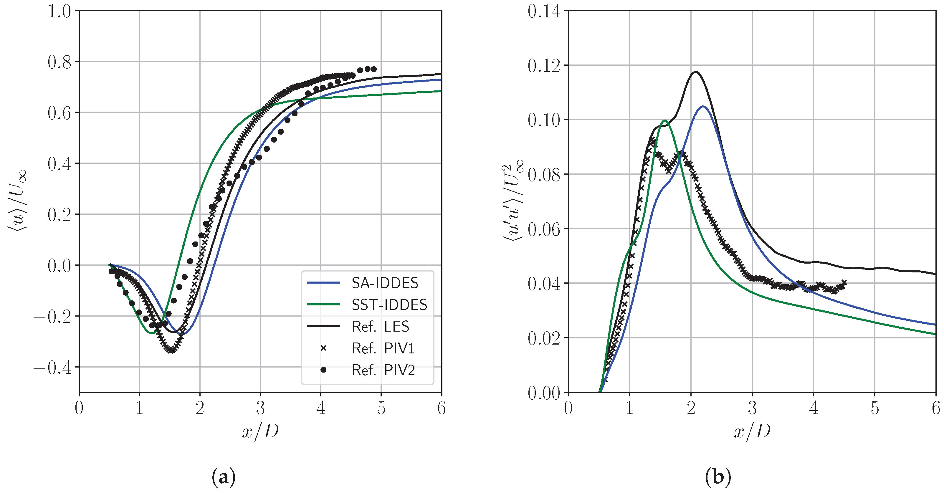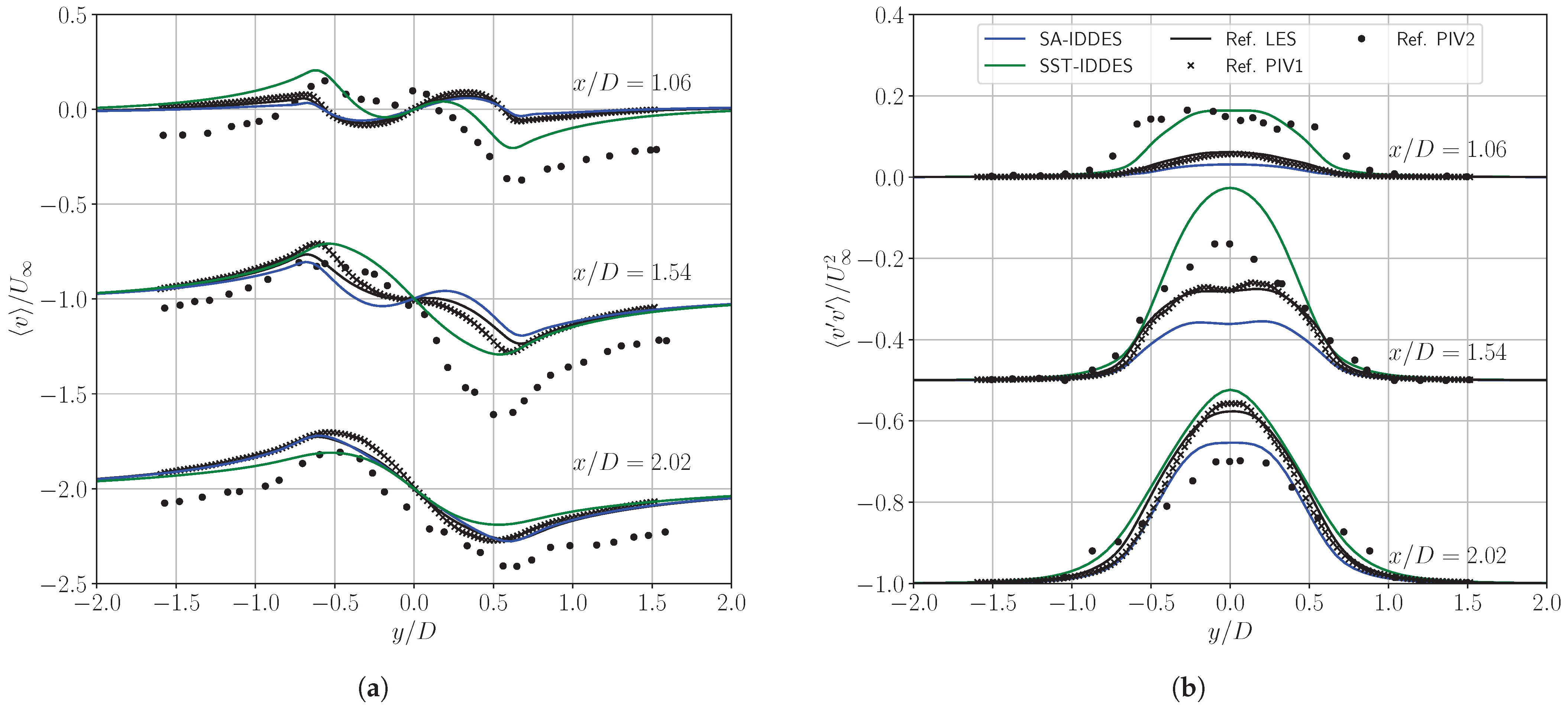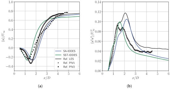 Finally, Figure 6b and Figure 7b show, respectively, the variances of the streamwise and transversal velocities along the y-axis. Two peaks can be observed in the longitudinal velocity fluctuations corresponding to the shear layers. Once again, two different profiles can be observed, especially in the very-near-wake region; however, both the position and the amplitude of the peaks are in good agreement with the respective reference data. Hence, the good performance of the SA-IDDES and SST-IDDES models can also be confirmed for the prediction of velocity fluctuations.