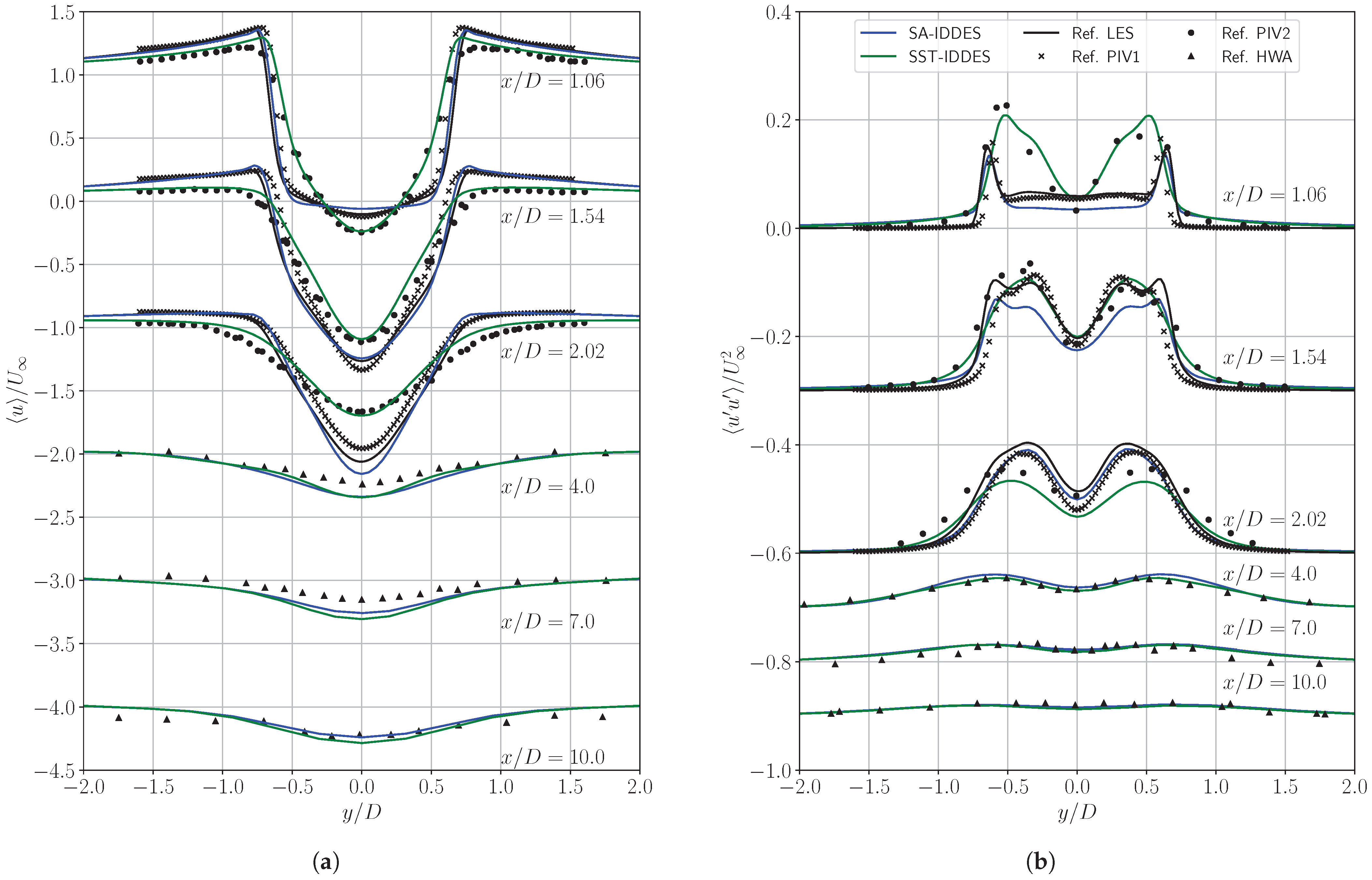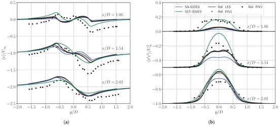 Transversal profiles of averaged longitudinal velocity at different streamwise positions are presented in Figure 6a. The already introduced, most noticeable difference between the two solutions can be observed in the profiles at , where the velocity defect in the near-wake region of the cylinder is predicted with a U-shape by the SA-IDDES model, in perfect agreement with [], and it is predicted with a V-shape by the SST-IDDES model, in accordance with []. Additional calculations (not reported in this manuscript) using a spanwise length of were performed to explore the possibility that our results might be sensitive to the spanwise dimension, as in []. However, we observed the same shape independent of the spanwise length. At and , both shapes tend to resemble a V-shape, both in very good agreement with the respective reference solutions. Further downstream, all profiles gradually flatten, reproducing the measurements of [].