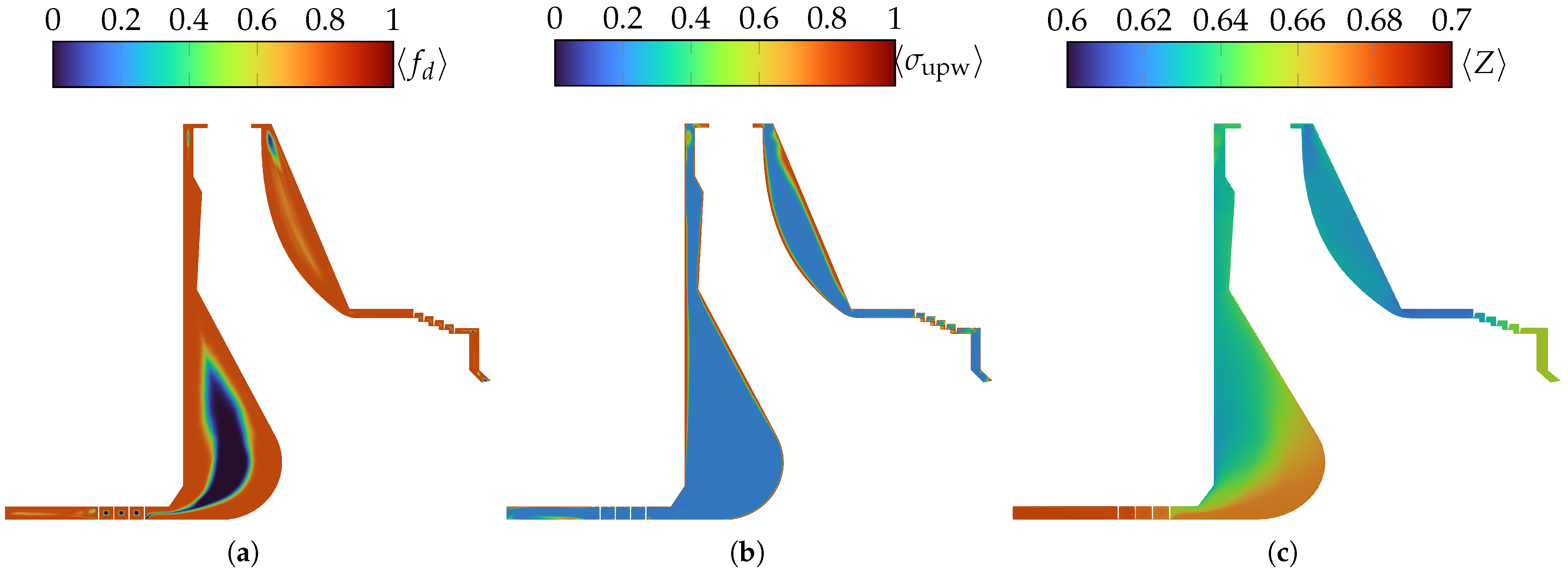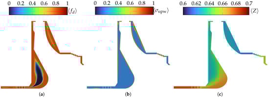 DES model assessment through meridional view of the rotor cavities: (a) mean value of shielding function, ; (b) flux blending factor, ; and (c) assessment of thermodynamic states through compressibility factor Z.