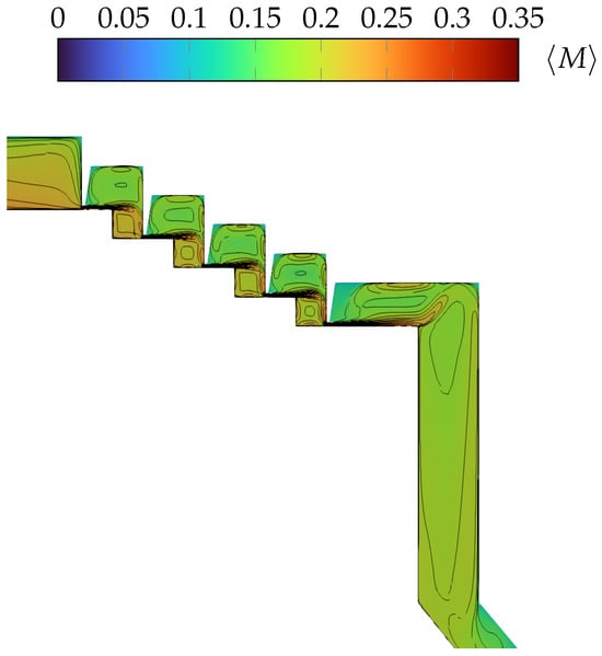 Meridional snapshot of averaged absolute Mach number, M, contours in stepped labyrinth seal mounted on the cover disk cavity.