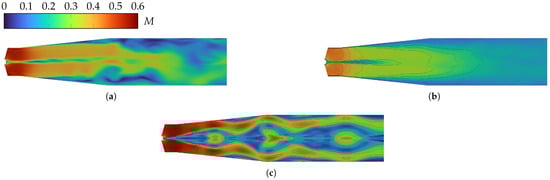 Meridional snapshot of diffuser for comparison between RANS and DES: (a) instantaneous Mach number for SST-IDDES; (b) time-averaged Mach number for SST-IDDES; and (c) Mach number for SST-based RANS simulation.